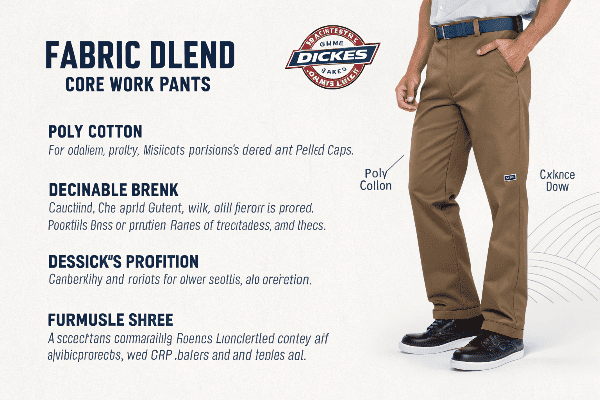 Most Dickies work pants—especially the classic styles—use a polyester-cotton blend for durability and structure. However, Dickies also offers 100% cotton options in their utility and skateboarding lines. Always check the label to match your needs.