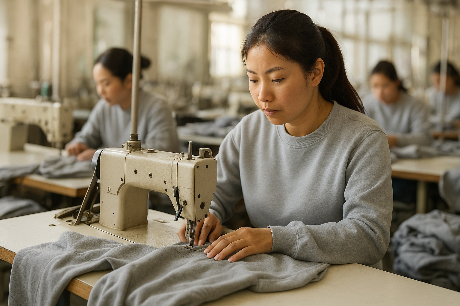 Alt text: skilled garment workers sewing sweatshirts on industrial sewing machines in China factory