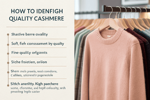 High-quality cashmere feels soft and smooth, has tight knitting, and keeps shape. Always check by touch and look instead of relying only on the label.
