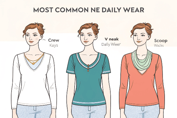 Crew neck, V-neck, and scoop neck are the most common necklines in daily wear. They’re simple, easy to style, and suitable for most body types.