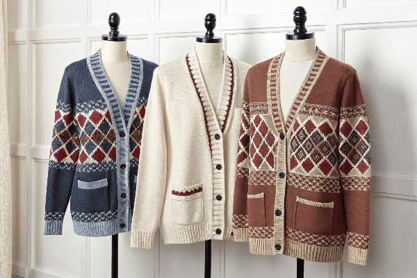 - Choose cable-knit textures with large buttons for a vintage vibe